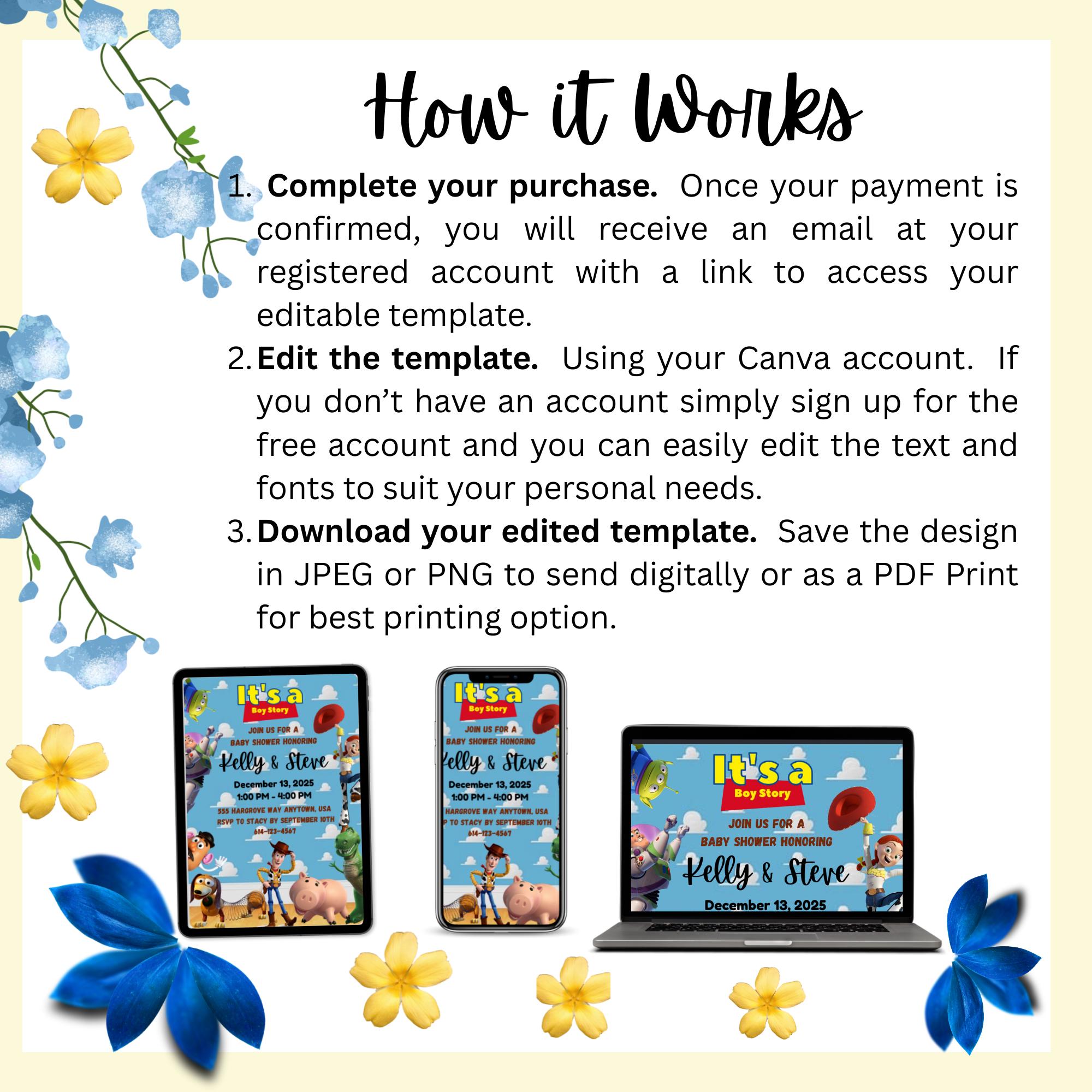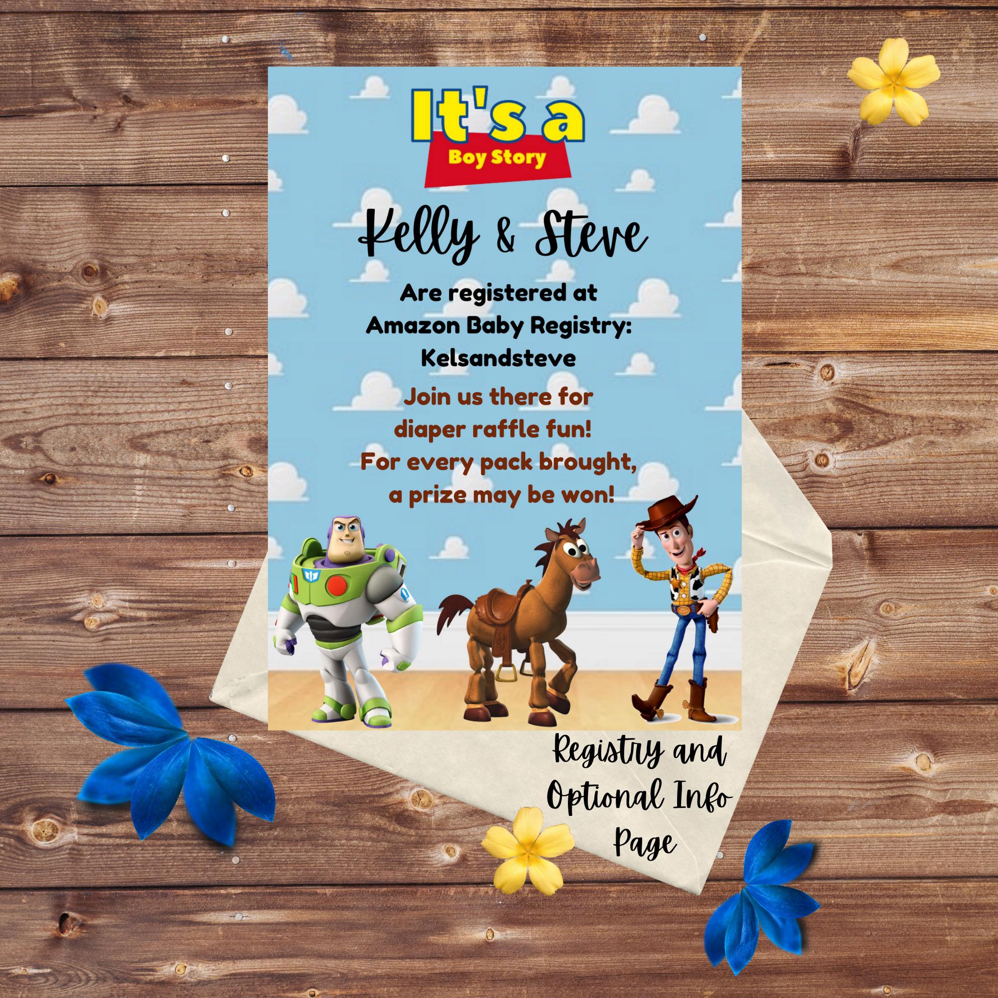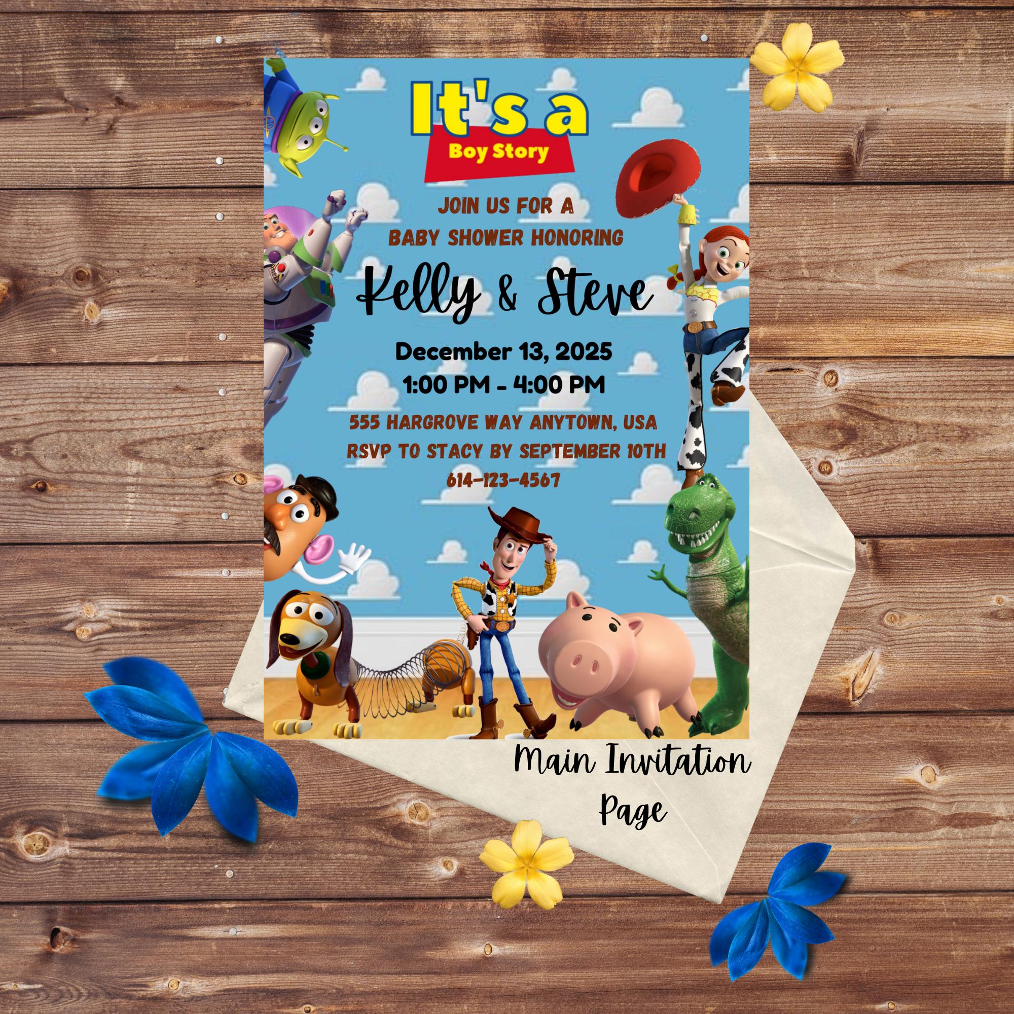 This is a 2 page (front and back) optional and text customizable template with a "Boy Story" Theme. You can send it digitally to guests or print. This template will make sending your invitations Easy-Peazy! Perfect for your "Toy Story" Themed shower!